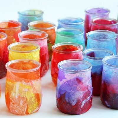 Cada any en fem, per regalar als mestres de l'escola, als amics i a la família. És ja un clàssic a casa nostra! Durant l'any anem guardant diferents pots de vidre (de iogur, llegums ) que es tranformaran en una espelmes molt colorides i lluminoses. Només ens cal girar els pots cap per avall i anar-hi enganxant trossets petits de paper de seda de diferents colors, pinzellant amb una cola blanca diluïda en una mica d'aigua. Un cop s'assequen, ja podem col·locar-hi una espelmeta de te a l'interior.