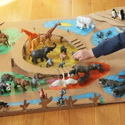 Un bon rectangle de cartró serà un terreny fantàstic per jugar amb els animals del zoo o de la granja, delimitant els espais amb tintes o paper de seda de diferents colors, creant muntanyes amb la sobreposició dels cartrons (com corbes de nivell)...