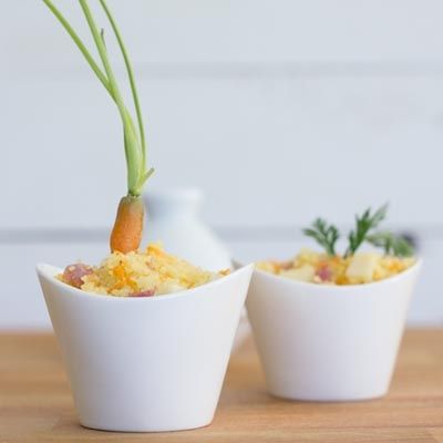 - Ho servim en petits bols (o testos petits) que omplirem fins dalt i després hi plantarem una pastanaga baby.