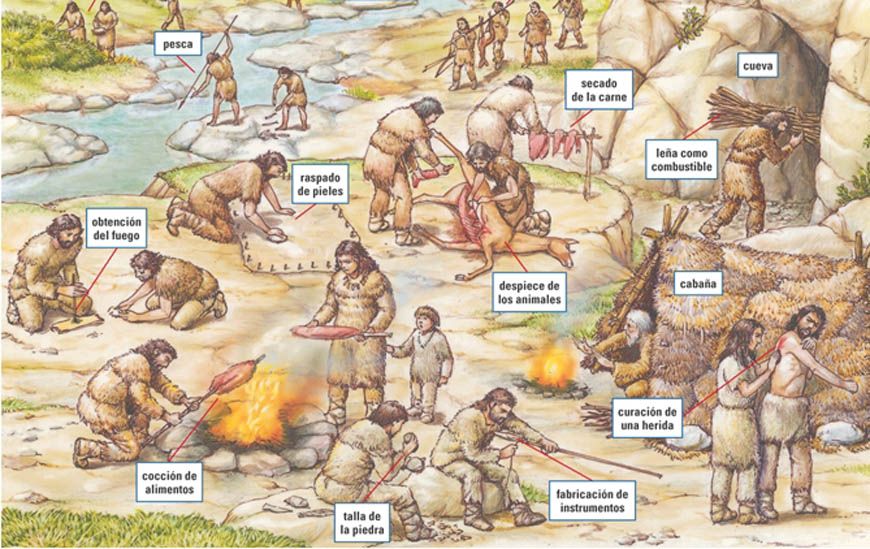 Quan els homes venien de caçar les dones s'encarregaven de tallar la carn, treure la pell de l'animal, treballar la pell per fer roba etc...