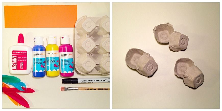 - Talla la cartolina en forma de rombe i doblega per la meitat per donar-li forma de bec, enganxa'l i dibuixa dos ulls amb el bolígraf permanent a continuació fes un forat i incorpora la ploma..
