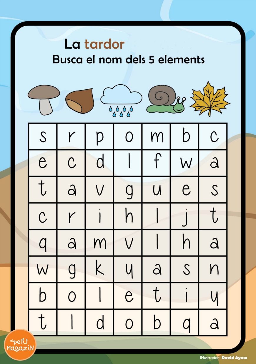 Hola nens i nenes, en aquesta sopa de lletres heu de buscar els noms de 5 elements de tardor. Us animeu?