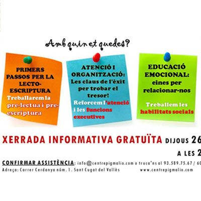 Cal confirmar assistència a la xerrada informativa a info@centrepigmalio.com o al tlf 935 897 567 / 609 058 196