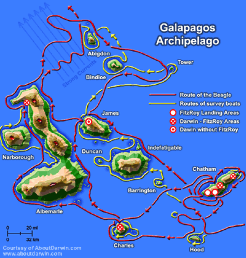 Mentre el Beagle continuava fent estudis cartogràfics, Charles Darwin va desembarcar per estudiar les illes. Va ser llavors quan se'n va adonar que les illes estaven formades per terra volcànica, és a dir, que havien sorgit després d'una erupció volcànica, després de refredar-se la lava s'havien format les illes. Aleshores es va preguntar: d'on havia sorgit la fauna? (tortugues gegants, iguanes, pinçons (classe d'ocells), cormorans (classe d'0cells marins) etc.) Finalment va arribar a la conclusió que havien arribat del continent Sud-americà , volant, nedant o navegant sobre branques d'arbres empesos per tempestes o per les corrents marines.