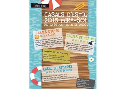 Marta 28 d’abril de 2015 11:38 Mireu la oferta de Casals d'Estiu que ofereix el Casal Mira-sol! Per a nens i nenes de 3 a 12 anys. Inscripcions del 4 al 29 de maig. No t'adormis!