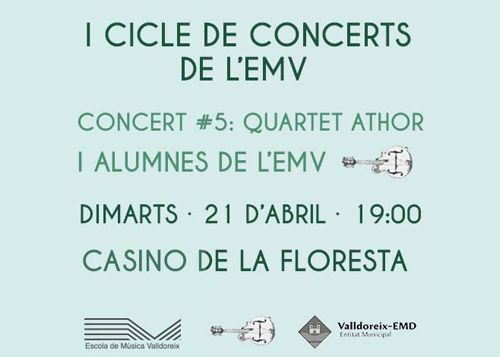 Cinquè concert del Cicle de Concerts de l'EMV a càrrec del Quartet de Corda Athor, grup convidat per l'Escola de Música de Valldoreix, i dels alumnes de més nivell del centre.