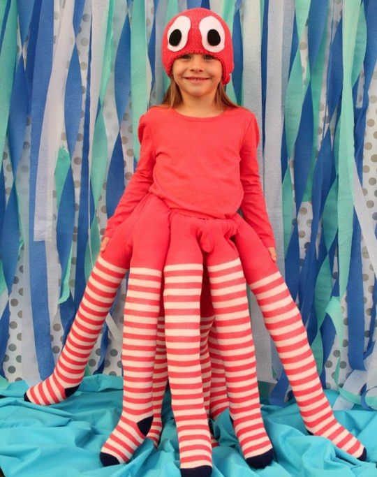 Disfressa de pop (més fàcil del que sembla): amb 4 mitjes de "leotardo" farem les 8 potes del pop. Unes les porta el nen o nena que es disfressa, les altres les farcim amb guata (el farcit que es fa servir per als peluixos, a la venda a botigues de teles o merceries). Les cosim a una samarreta que hi faci joc. Si creiem que fa falta podem retallar cercles de feltre i els enganxem o cosim a les potes per fer com si fossin ventoses. Si a sobre podem afegir-hi un barret amb ulls com el de la nena de la foto, fantàstic!