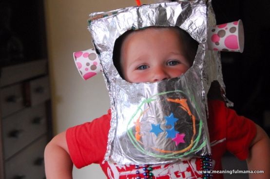 Màscara de robot amb bossa de cartró i paper de plata: de la bossa de cartró prou gran i ampla per ficar-la pel cap del revés, retallem les nanses i fem un forat a l'alçada dels ulls perquè el nen o nena hi pugui veure. Ho folrem amb paper de plata enganxat amb cola blanca i afegim detalls amb cartró, cartolina, goma EVA i pintura. Hi podem posar també uns gots de paper fent d'orelles o antenes. Quin material tenim per casa que pugui ser útil?? Els petits ens hi han d'ajudar!