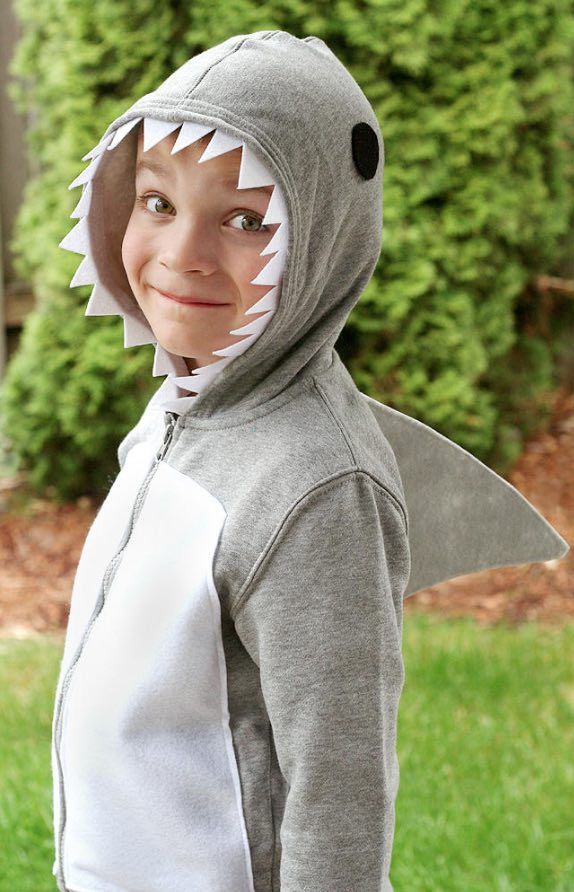 Disfressa de tauró molt fàcil: tallant feltre blanca amb forma de dents, negra per als ulls i cosint-ho a un jersei gris amb caputxa. Idea molt senzilla de fer, no trobes?