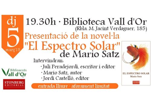 Dijous 5 de març a les 19:30h es presenta aquesta novel·la, El Espectro Solar de Mario Satz, escriptor valldoreixenc, poeta, narrador, traductor i assagista.