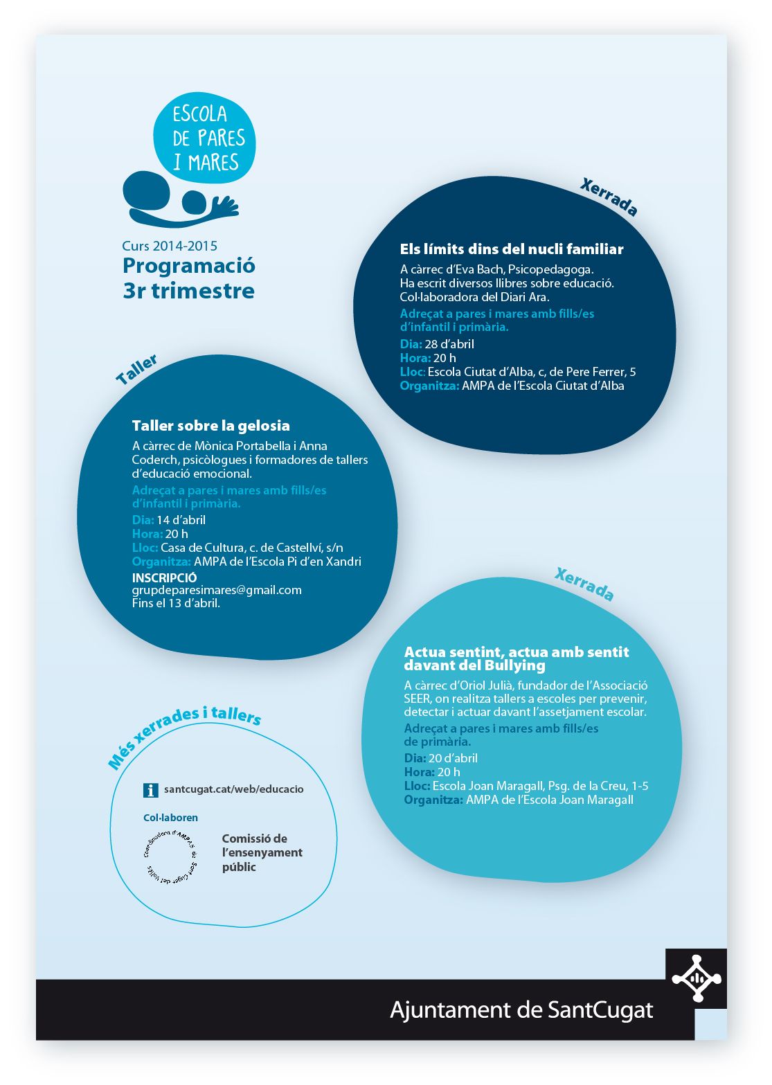 L'escola de pares i mares ofereix un conjunt d'activitats, xerrades, cicles informatius i cursos que volen donar un cop de mà als pares i mares, que de vegades ens podem sentir desbordats o simplement, desorientats.