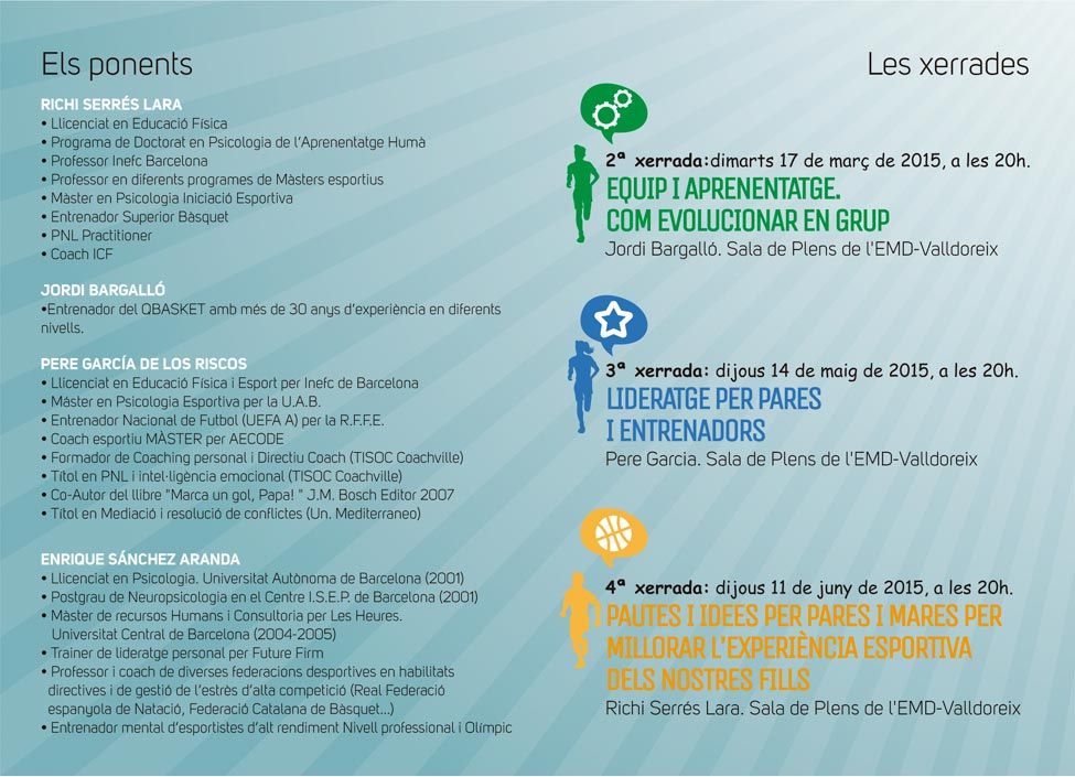 El cicle tractarà temes com l'autoestima, el lideratge, la gestió de grups i la millora de l'experiència esportiva dels infants. Totes les sessions se celebraran a les 20.00 hores a la Sala de Plens de la Casa de la Vila de Valldoreix.