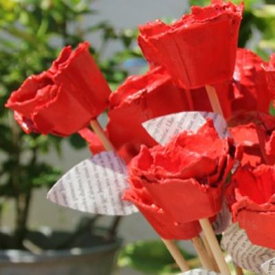 Recortamos una caja de huevos en partes individuales y las sobreponemos, de tres en tres (la más pequeña por dentro). Hagamos un agujero a la parte central y pasamos un palo de brocheta o un trozo de alambre. Lo fijamos todo con silicona, pegament o cinta adhesiva (por debajo la rosa). Después podemos pintar la rosa con tinta acrílica roja o con un spray (protegiendo el tallo con cinta de papel), y posteriormente cubrirla con barniz. Para hacer las hojas se puede utilizar cartulina, cinta whashi tapo o papel de diario o de libros viejos, endurecido y fijado con pegamento blanco.
