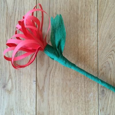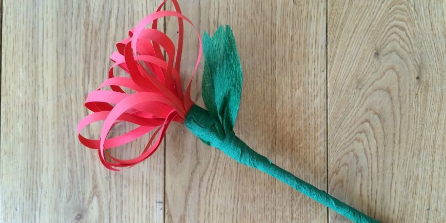 - Engancha la última tira de papel pinotxo verde a la parte superior del tronco de la flor creando una hoja.