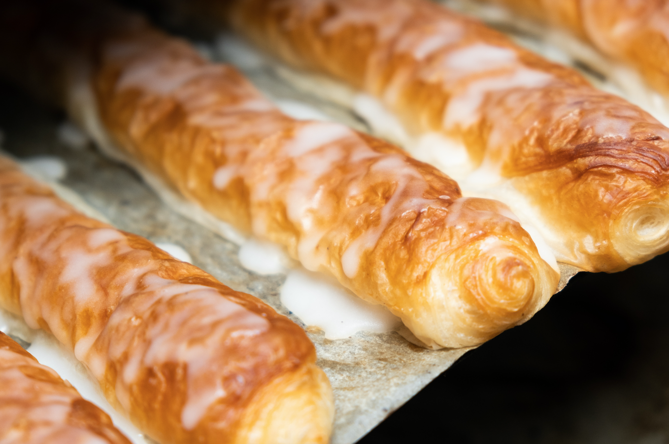 - Una vez la masa ha doblado el volumen, cogemos pequeñas porciones de unos 25 g y con un rodillo estiramos la masa en forma de rectángulo que enrollamos sobre sí mismo.
