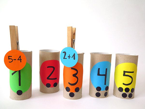 3. Para niños más grandes, podéis practicar también la aritmética enganchando diferentes operaciones con un papelito a una aguja de extender ropa, y que lo enganchen al tubo correspondiente.
