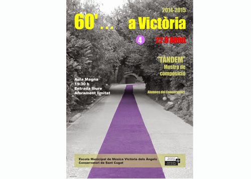 Redacció 20 abril de 2015 09:02 Del ciclo "60'... a Victoria", concierto con composiciones escritas e interpretadas por alumnas de Grado Profesional. En el aula Magna Entrada libre. Aforo limitado. Organiza: Ayuntamiento de Sant Cugat