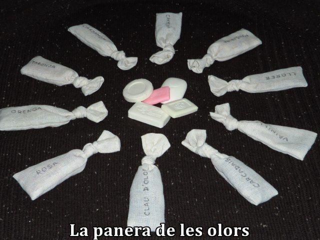 La Panera de les Olors està formada per conjunt de saquets cosits amb roba de cortina i doble costura per tal que no deixin escapar res del contingut. Vaig triar un color cru molt suau per tal que els colors de la roba no entorpissin l'exploració olfactiva. A dins hi vaig posar escorces de mandarina i de taronja, troncs de vainilla i de canyella, fulles de llorer, granets de carcadais, roses de pitiminí i claus d'olor. La textura dels diversos continguts en branca, flor, escorces seques i en granets ofereix al mateix temps diversitat al tacte i ajuda a encuriosir al nen.