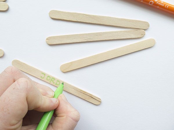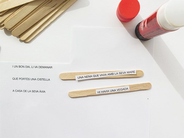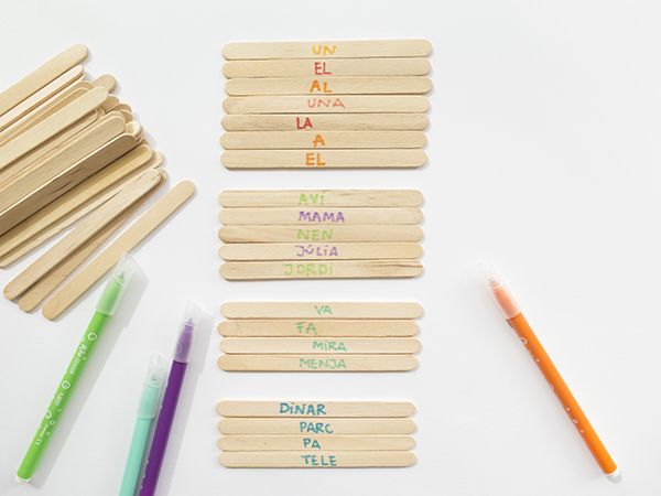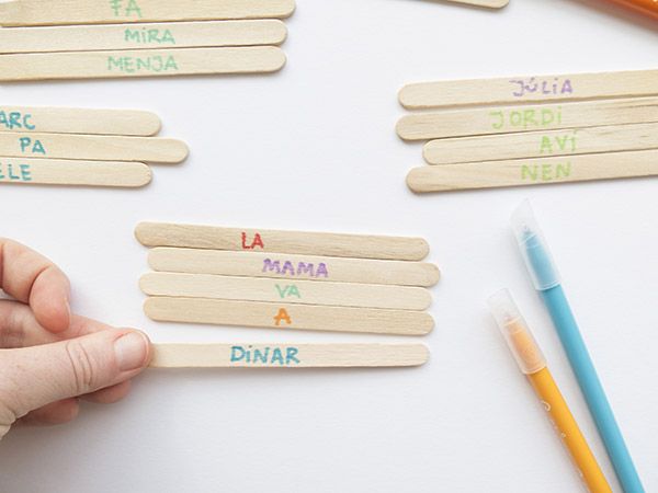 L'activitat és ben fàcil de preparar i també podeu demanar que us hi ajudin. Es tracta d'escriure paraules a cada un dels pals de fusta i després deixar-los al seu aire per a que construeixin frases o històries.