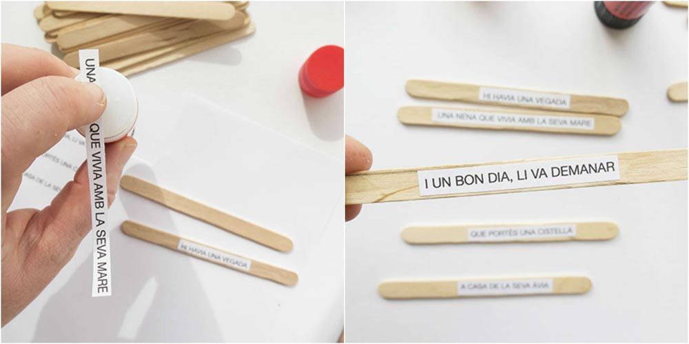 Per a nens i nenes que ja llegeixen més i tenen més domini de la comprensió lectora, podrem preparar-los històries i enganxar a cada pal de fusta una frase, per acabar ordenant-les i poder llegir el conte.