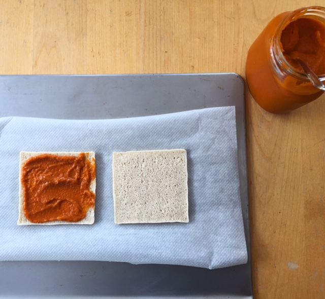 Posem a la safata de forn els panets oberts i els untem amb la salsa de tomàquet.
