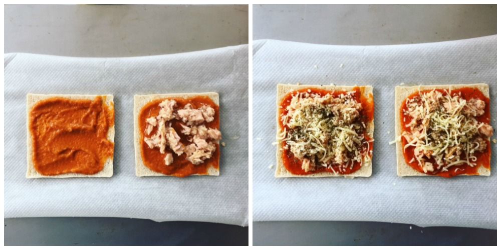 Jo us proposo una versió molt senzilla, amb tonyina, però hi podeu posar tot allò que us agradi: gambes cuites, salsitxes de Frankfurt, tomàquets cirera, cansalada o bacon, trossets de mozzarella o altre formatge, pernil Simplement tingueu la precaució de posar-hi ingredients que ja estiguin cuits perquè les pizzetes estaran poca estona al forn, només per escalfar-se. El tomàquet també ha d'estar ja fregit (casolà o industrial), perquè sinó perdrà molta aigua i estovarà el pa.