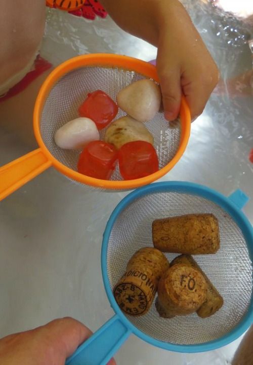 Una manera d'experimentar a la piscineta pot ser investigar la flotació dels objectes que hi posem. En aquesta ocasió posaríem un grapat de taps de suro ben nets, unes pedretes de les que decoren aquaris, i algun objecte que tingui una densitat mitja, de manera que quan el tiris s'enfonsi però que vagi pujant cap a la superfície. Nosaltres vàrem triar tirar-hi uns cubs petits de plàstic amb líquid a dins que serveixen per congelar i posar a les begudes sense aigualir-les.