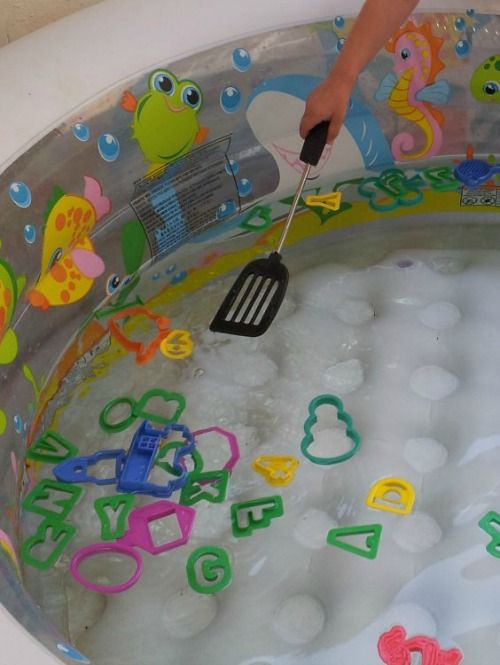 Consisteix a posar a la piscineta moltlles de plastilina o de galetes de colors diversos, figuretes o lletres de foam, desar plats o recipients de colors a una cadira i donar als nens coladors o pales de cuinar per a pescar els objectes que suren i s'escapen per l'aigua.