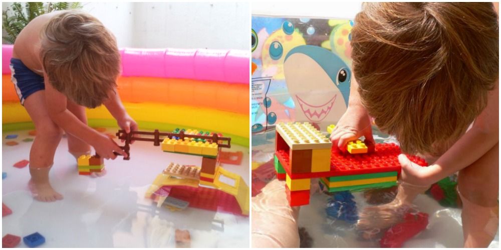 El Lego a l'aigua és una de les activitats més demanades a casa. S'ha d'anar amb compte, però, en triar les peces que no estiguin decorades, ja que no sabem si poden destenyir, i també cal vigilar amb les arestes, ja que si les trepitgen poden fer-se mal i rebentar la piscineta.