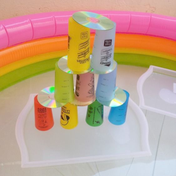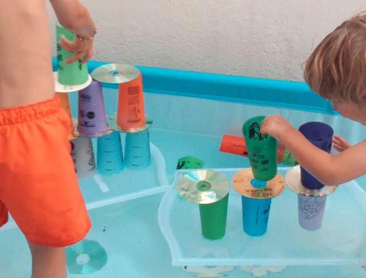 La darrera activitat que presentem també ha tingut èxit en repetides ocasions a casa. Es tracta d'oferir als nens safates on hi han de construir les torres que vulguin combinant cd's i gots de plàstic. Sembla fàcil però no ho és gens, donada la inestabilitat de les safates sobre l'aigua en constant moviment pels desplaçaments dels nens. Es pot oferir l'opció de construir torres amb gots plens d'aigua a diverses mides per així practicar amb les quantitats i els contrapesos. O l'opció d'anar omplint les construccions un cop ja fetes amb aigua per veure què passa Cal paciència, bon humor, esperit d'experimentació i resistència a les esquitxades per a gaudir d'aquest joc, però és molt interessant i divertit.