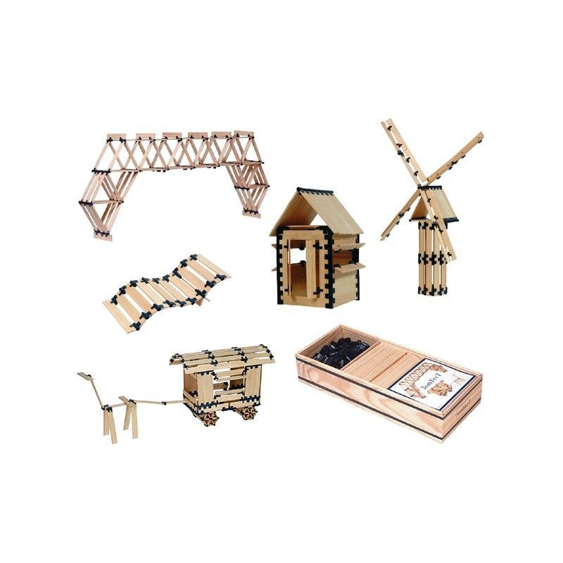 Un joc de construcció original i diferent: fet de fusta amb peces que permeten que hi hagi parts mòbils.