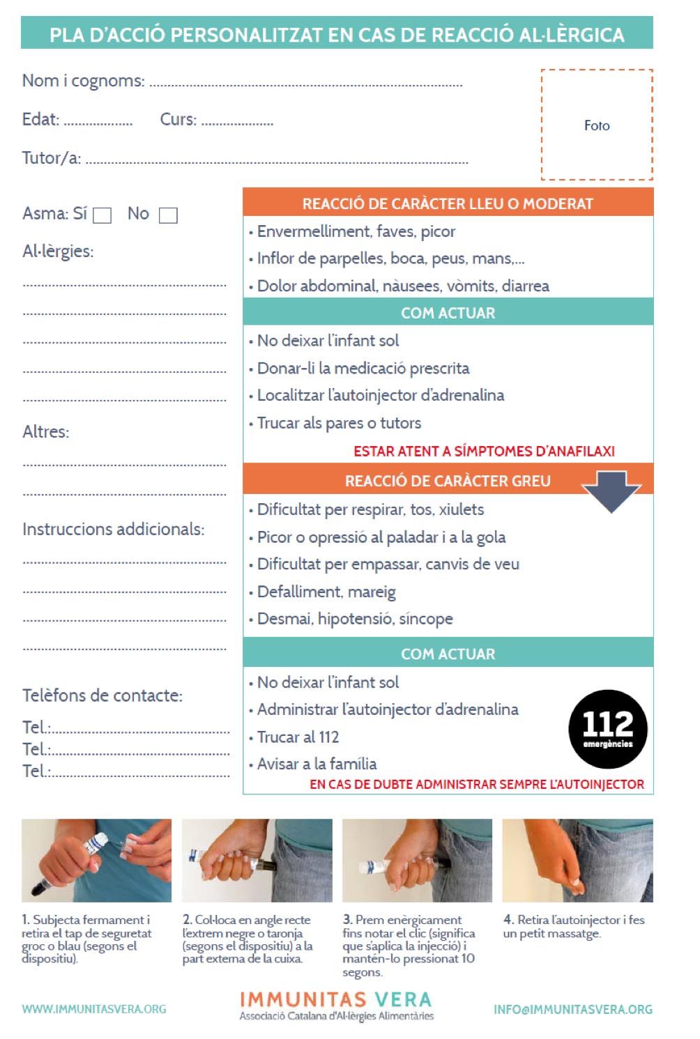 En aquest sentit existeix un document que s'anomena Pla d'acció per a l'escola que recull les dades de l'alumne, telèfons de contacte, prescripció de medicaments i la descripció dels símptomes d'una reacció al·lèrgica i com actuar-hi. Aquest document es pot descarregar a la web d'"Immunitas Vera".