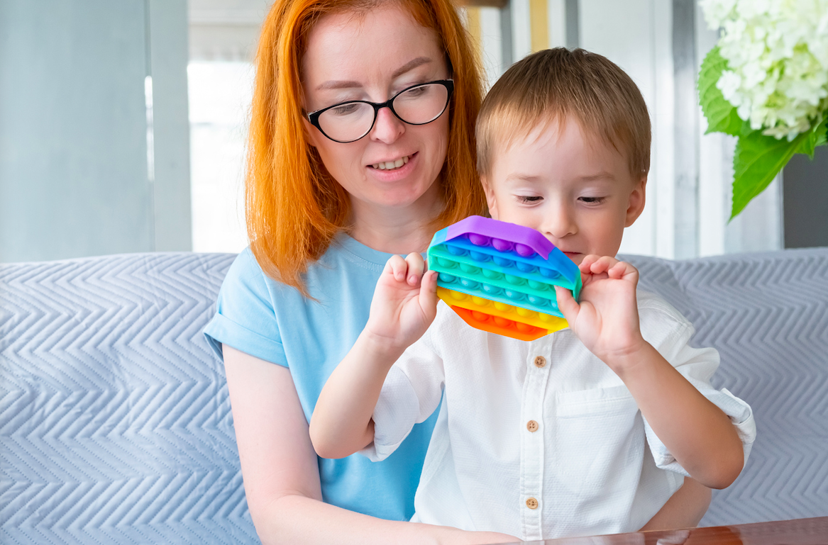 Aquesta senzilla joguina de silicona està dissenyada amb forma de cor, unicorns, rodona, quadrat... i feta amb colors cridaners. Té unes bombolles que s'empenyen amb el dit i simulen una sensació tàctil com el so que genera el plàstic d'embalar. Una vegada s'acaba de pressionar els cercles, se li pot donar la volta i tornar a començar de nou, tenint un plàstic de bombolles sense fi.